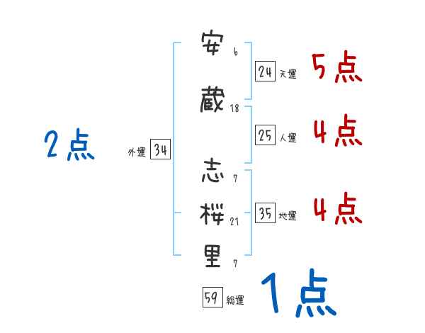 天運![]() | 安蔵志桜里さんの天運は24画の5つ星!家庭運が良く順調な人生。金運にも恵まれる。 家系が持つ宿命的な運勢を表します。祖先から受け継いだ苗字ですので自分の力が及びません。家柄を象徴します。 |
