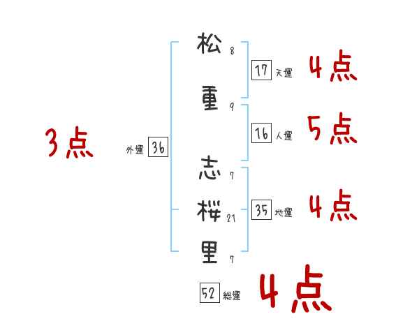 外運![]() | 松重志桜里さんの外運は36画の3つ星!先見性が豊かです。多少神経質で苦労することも。 生活面を象徴する運勢です。外部から受ける影響力を表し、結婚運、家庭運や職場、環境への順応性を表します。 |