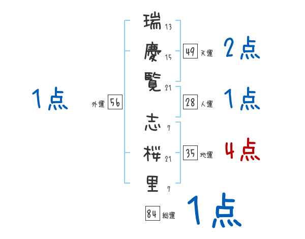 外運![]() | 瑞慶覧志桜里さんの外運は56画の1つ星!消極的で無気力になりがち。誠実な気持ちが必要でしょう。 生活面を象徴する運勢です。外部から受ける影響力を表し、結婚運、家庭運や職場、環境への順応性を表します。 |