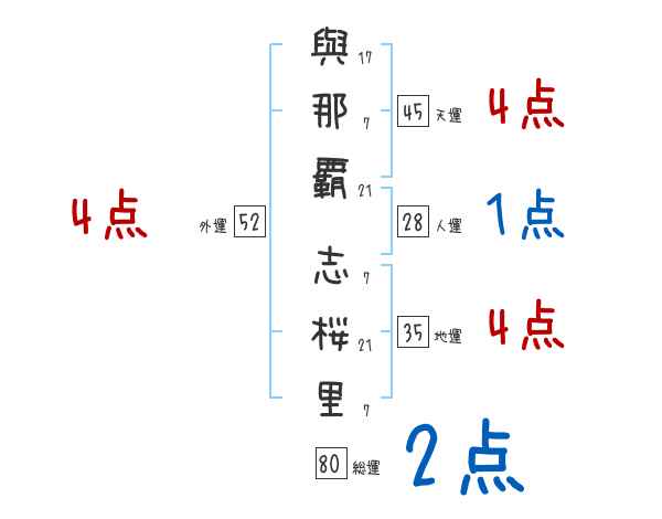 総運![]() | 與那覇志桜里さんの総運は80画の2つ星!病弱で健康に注意。多少苦労することがあるかも。 あなたの人生を表す1番重要な運勢です。生涯を通じて影響する総合運となり、主に50歳以降の晩年期に影響を及ぼします。 |