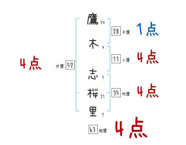 天運![]() | 鷹木志桜里さんの天運は28画の1つ星!家庭環境に注意。スポーツで活躍できる能力があるかも。 家系が持つ宿命的な運勢を表します。祖先から受け継いだ苗字ですので自分の力が及びません。家柄を象徴します。 |