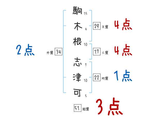 天運![]() | 駒木根志津可さんの天運は29画の4つ星!完全主義で才能がある。厳格な心の持ち主。 家系が持つ宿命的な運勢を表します。祖先から受け継いだ苗字ですので自分の力が及びません。家柄を象徴します。 |