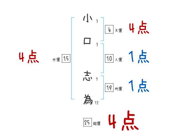 天運![]() | 小口志為さんの天運は6画の4つ星!慎重な努力家で信頼を得る。誠実な精神で向上心に優れる。 家系が持つ宿命的な運勢を表します。祖先から受け継いだ苗字ですので自分の力が及びません。家柄を象徴します。 |
