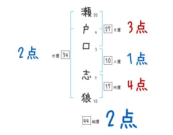 天運![]() | 瀬戸口志狼さんの天運は27画の3つ星!頭脳明晰だが強情で摩擦が多い傾向。孤立に注意。 家系が持つ宿命的な運勢を表します。祖先から受け継いだ苗字ですので自分の力が及びません。家柄を象徴します。 |