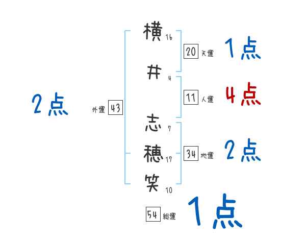 総運![]() | 横井志穂笑さんの総運は54画の1つ星!トラブルが多いかも。周りをよく見て協調して過ごしましょう。 あなたの人生を表す1番重要な運勢です。生涯を通じて影響する総合運となり、主に50歳以降の晩年期に影響を及ぼします。 |