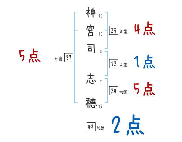 天運![]() | 神宮司志穂さんの天運は25画の4つ星!個性があり才能があふれる。強運の持ち主で発展する。 家系が持つ宿命的な運勢を表します。祖先から受け継いだ苗字ですので自分の力が及びません。家柄を象徴します。 |