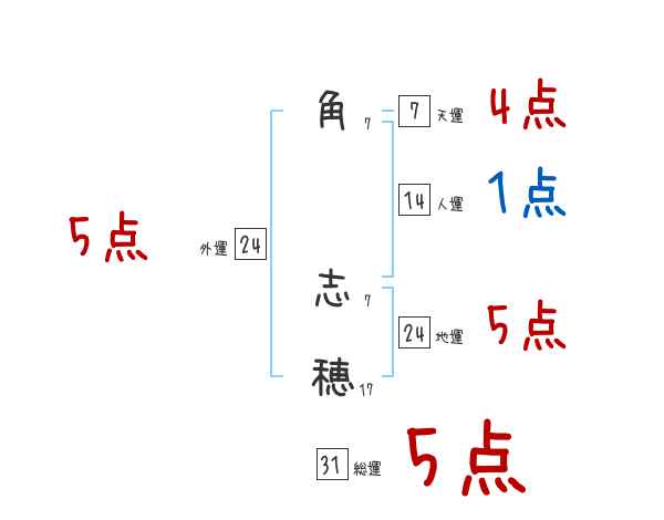 天運![]() | 角志穂さんの天運は7画の4つ星!強い意志や信念を持ち独立心が強い。自立する。 家系が持つ宿命的な運勢を表します。祖先から受け継いだ苗字ですので自分の力が及びません。家柄を象徴します。 |