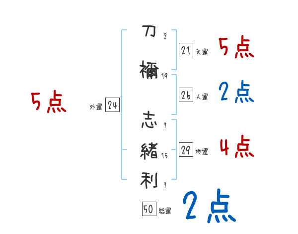 外運![]() | 刀禰志緒利さんの外運は24画の5つ星!家庭運が良く順調な人生。金運にも恵まれる。 生活面を象徴する運勢です。外部から受ける影響力を表し、結婚運、家庭運や職場、環境への順応性を表します。 |