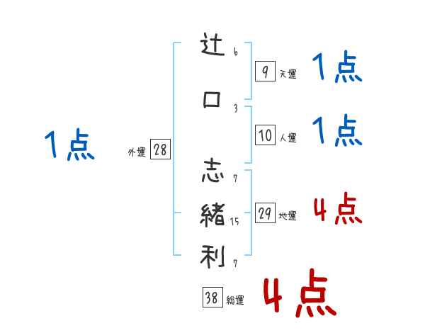 外運![]() | 辻口志緒利さんの外運は28画の1つ星!家庭環境に注意。スポーツで活躍できる能力があるかも。 生活面を象徴する運勢です。外部から受ける影響力を表し、結婚運、家庭運や職場、環境への順応性を表します。 |