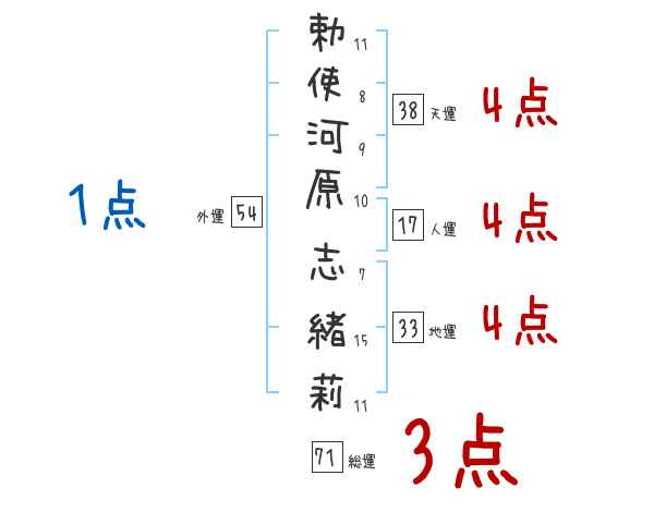 天運![]() | 勅使河原志緒莉さんの天運は38画の4つ星!温厚な性格で技術的な才能を発揮する。職人的な仕事に向いている。 家系が持つ宿命的な運勢を表します。祖先から受け継いだ苗字ですので自分の力が及びません。家柄を象徴します。 |