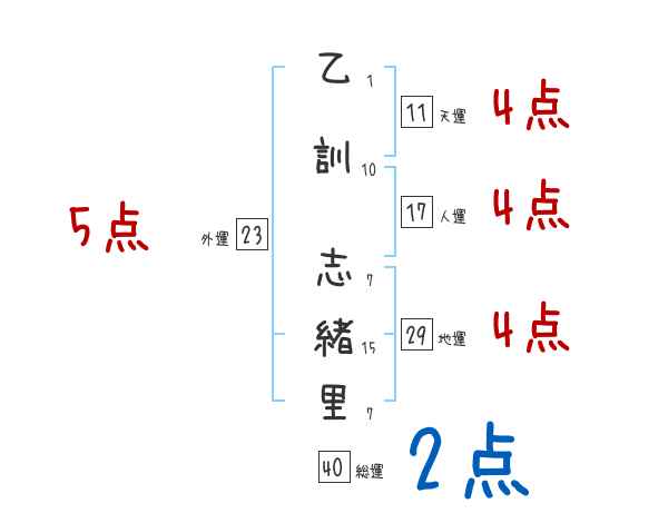 天運![]() | 乙訓志緒里さんの天運は11画の4つ星!着実に富や地位を得る幸運な人生。 家系が持つ宿命的な運勢を表します。祖先から受け継いだ苗字ですので自分の力が及びません。家柄を象徴します。 |