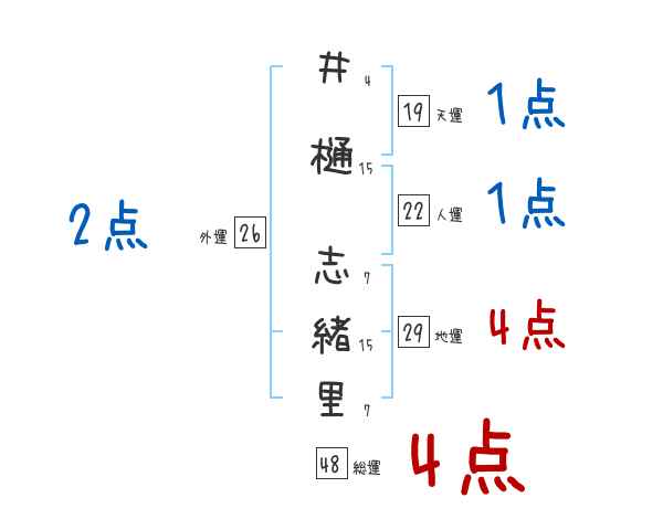 外運![]() | 井樋志緒里さんの外運は26画の2つ星!波瀾万丈かも。信頼できる人を大事にしましょう。 生活面を象徴する運勢です。外部から受ける影響力を表し、結婚運、家庭運や職場、環境への順応性を表します。 |