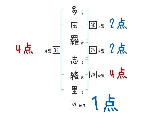 天運![]() | 多田羅志緒里さんの天運は30画の2つ星!浮き沈みの激しさに注意しましょう。 家系が持つ宿命的な運勢を表します。祖先から受け継いだ苗字ですので自分の力が及びません。家柄を象徴します。 |