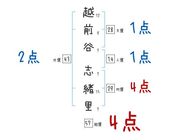 外運![]() | 越前谷志緒里さんの外運は43画の2つ星!頑固な性格で独立心が強いかも。やや非現実的で浪費に注意しましょう。 生活面を象徴する運勢です。外部から受ける影響力を表し、結婚運、家庭運や職場、環境への順応性を表します。 |