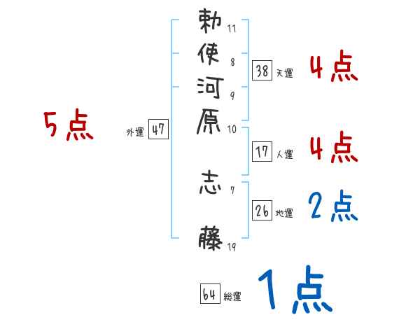 外運![]() | 勅使河原志藤さんの外運は47画の5つ星!実力が開花し発展する円満な人生。財に恵まれる。 生活面を象徴する運勢です。外部から受ける影響力を表し、結婚運、家庭運や職場、環境への順応性を表します。 |