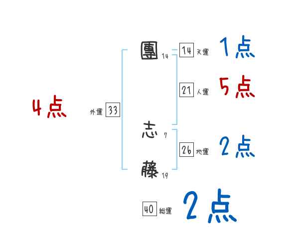 人運![]() | 團志藤さんの人運は21画の5つ星!統率力がある。独立し成功する。名誉を手に入れる。 性格や才能などを表す2番目に重要な運勢です。人間関係や協調性、社会的な成功に影響します。主に20歳から50歳ぐらいまでの中年期の運勢を表します。 |