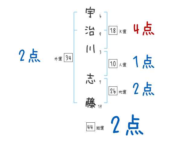 総運![]() | 宇治川志藤さんの総運は44画の2つ星!誠実で慎重な性格。物事を考えすぎないように注意しましょう。 あなたの人生を表す1番重要な運勢です。生涯を通じて影響する総合運となり、主に50歳以降の晩年期に影響を及ぼします。 |