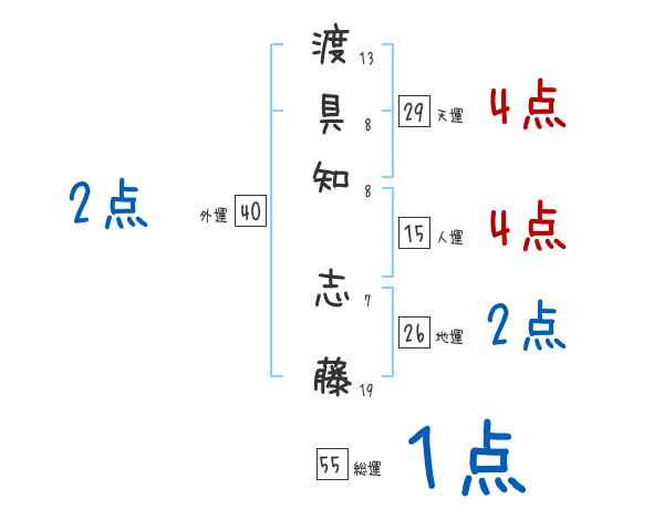 外運![]() | 渡具知志藤さんの外運は40画の2つ星!自信過剰で物事に固執するためトラブルに注意。 生活面を象徴する運勢です。外部から受ける影響力を表し、結婚運、家庭運や職場、環境への順応性を表します。 |