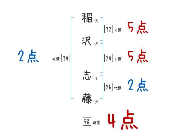 天運![]() | 稲沢志藤さんの天運は32画の5つ星!柔軟性があり成功する。チャンスが多く金運が良い。 家系が持つ宿命的な運勢を表します。祖先から受け継いだ苗字ですので自分の力が及びません。家柄を象徴します。 |