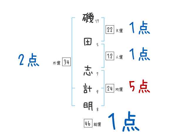 外運![]() | 磯田志計明さんの外運は34画の2つ星!独創性に優れるが、自尊心が強く災難に注意しましょう。 生活面を象徴する運勢です。外部から受ける影響力を表し、結婚運、家庭運や職場、環境への順応性を表します。 |