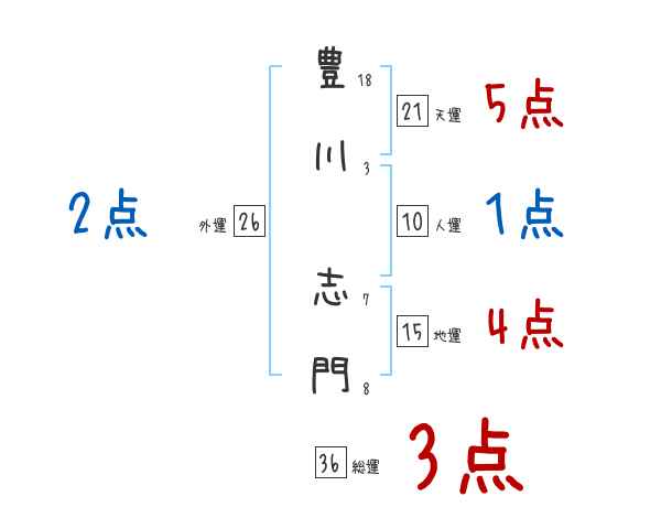 天運![]() | 豊川志門さんの天運は21画の5つ星!統率力がある。独立し成功する。名誉を手に入れる。 家系が持つ宿命的な運勢を表します。祖先から受け継いだ苗字ですので自分の力が及びません。家柄を象徴します。 |