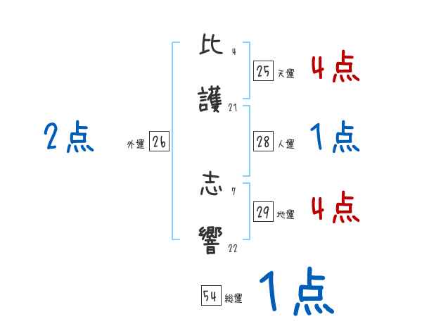 天運![]() | 比護志響さんの天運は25画の4つ星!個性があり才能があふれる。強運の持ち主で発展する。 家系が持つ宿命的な運勢を表します。祖先から受け継いだ苗字ですので自分の力が及びません。家柄を象徴します。 |