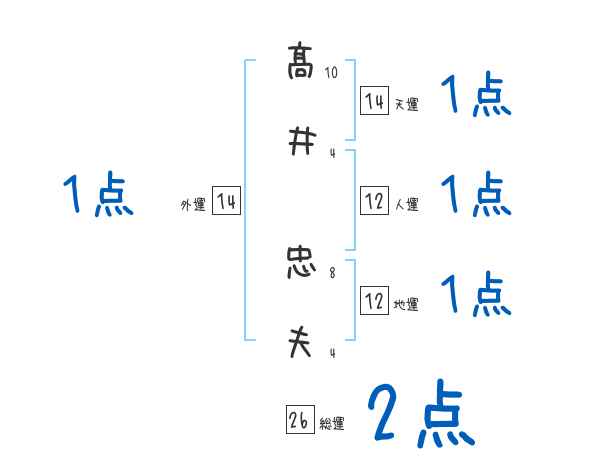 総運![]() | 髙井忠夫さんの総運は26画の2つ星!波瀾万丈かも。信頼できる人を大事にしましょう。 あなたの人生を表す1番重要な運勢です。生涯を通じて影響する総合運となり、主に50歳以降の晩年期に影響を及ぼします。 |