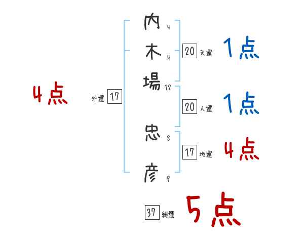 外運![]() | 内木場忠彦さんの外運は17画の4つ星!積極的な行動力。地位を気づき財産を手に入れる。純粋な心と直感力。 生活面を象徴する運勢です。外部から受ける影響力を表し、結婚運、家庭運や職場、環境への順応性を表します。 |