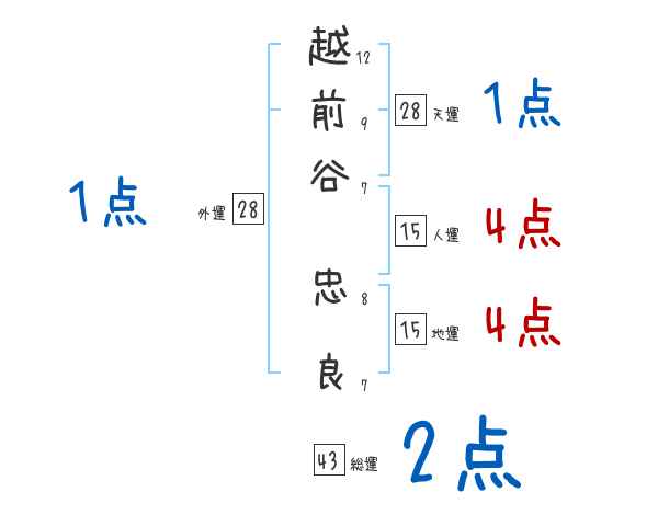 外運![]() | 越前谷忠良さんの外運は28画の1つ星!家庭環境に注意。スポーツで活躍できる能力があるかも。 生活面を象徴する運勢です。外部から受ける影響力を表し、結婚運、家庭運や職場、環境への順応性を表します。 |