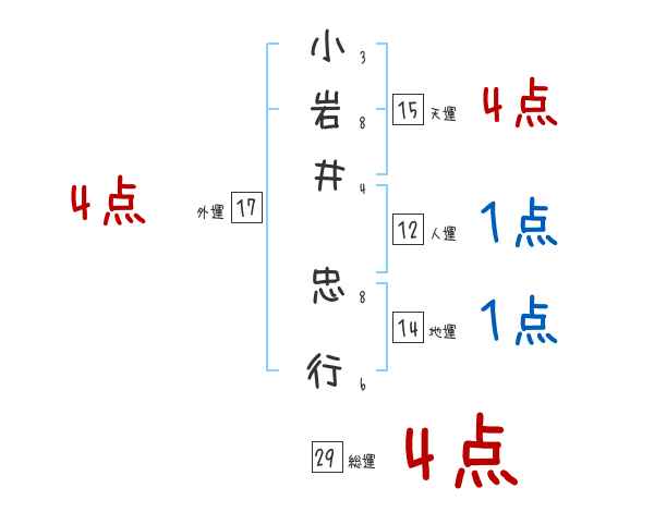 外運![]() | 小岩井忠行さんの外運は17画の4つ星!積極的な行動力。地位を気づき財産を手に入れる。純粋な心と直感力。 生活面を象徴する運勢です。外部から受ける影響力を表し、結婚運、家庭運や職場、環境への順応性を表します。 |