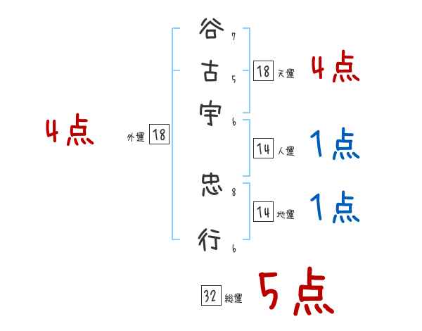 総運![]() | 谷古宇忠行さんの総運は32画の5つ星!柔軟性があり成功する。チャンスが多く金運が良い。 あなたの人生を表す1番重要な運勢です。生涯を通じて影響する総合運となり、主に50歳以降の晩年期に影響を及ぼします。 |