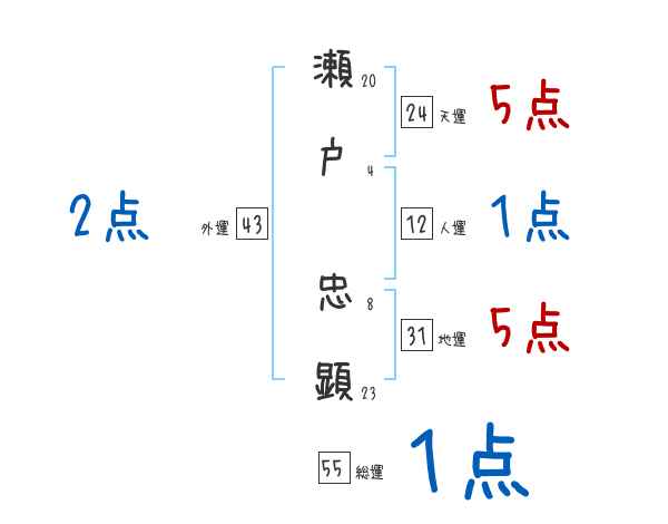 天運![]() | 瀬戸忠顕さんの天運は24画の5つ星!家庭運が良く順調な人生。金運にも恵まれる。 家系が持つ宿命的な運勢を表します。祖先から受け継いだ苗字ですので自分の力が及びません。家柄を象徴します。 |