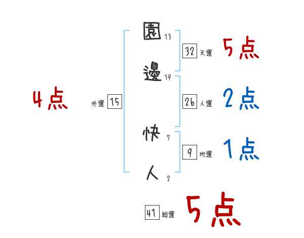 天運![]() | 園邊快人さんの天運は32画の5つ星!柔軟性があり成功する。チャンスが多く金運が良い。 家系が持つ宿命的な運勢を表します。祖先から受け継いだ苗字ですので自分の力が及びません。家柄を象徴します。 |