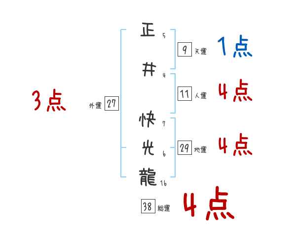 天運![]() | 正井快光龍さんの天運は9画の1つ星!消極的で才能を発揮することが苦手なことも。周りの意見に耳を傾けましょう。 家系が持つ宿命的な運勢を表します。祖先から受け継いだ苗字ですので自分の力が及びません。家柄を象徴します。 |