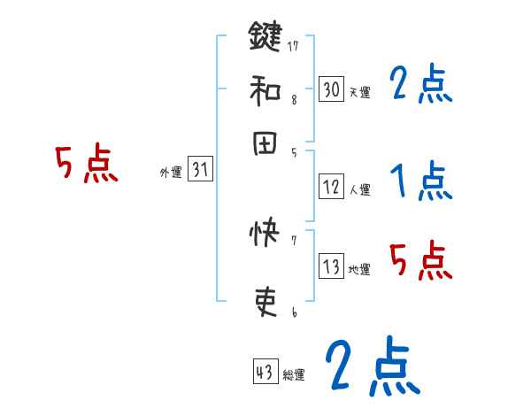 総運![]() | 鍵和田快吏さんの総運は43画の2つ星!頑固な性格で独立心が強いかも。やや非現実的で浪費に注意しましょう。 あなたの人生を表す1番重要な運勢です。生涯を通じて影響する総合運となり、主に50歳以降の晩年期に影響を及ぼします。 |