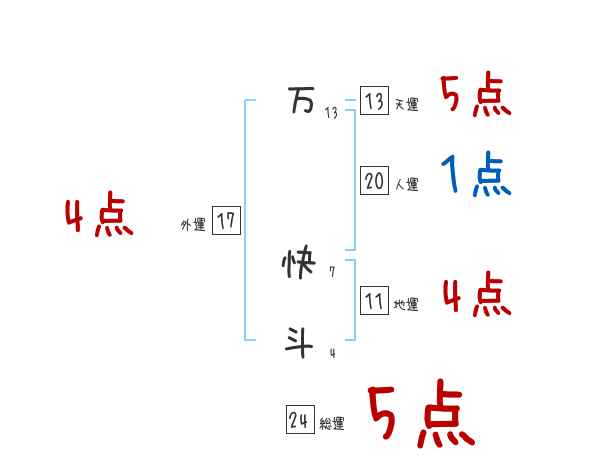 天運![]() | 万快斗さんの天運は13画の5つ星!才能に恵まれ人気がある。名声を手に入れる。円満な人生。 家系が持つ宿命的な運勢を表します。祖先から受け継いだ苗字ですので自分の力が及びません。家柄を象徴します。 |