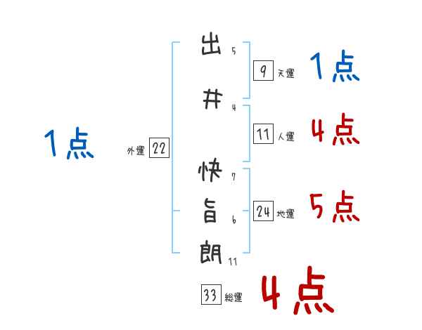 外運![]() | 出井快旨朗さんの外運は22画の1つ星!努力することが苦手ないっぽう手先が器用。芸術性にも優れる。 生活面を象徴する運勢です。外部から受ける影響力を表し、結婚運、家庭運や職場、環境への順応性を表します。 |