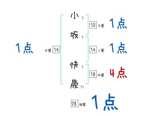 外運![]() | 小坂快晟さんの外運は14画の1つ星!人に対して優しいがストレスを溜め込みがち。人間関係のトラブルを避けるよう気をつけましょう。 生活面を象徴する運勢です。外部から受ける影響力を表し、結婚運、家庭運や職場、環境への順応性を表します。 |