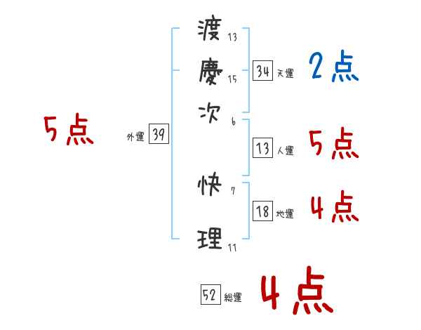 外運![]() | 渡慶次快理さんの外運は39画の5つ星!社交性に優れ人望が厚い。人の上に立ち成功する。 生活面を象徴する運勢です。外部から受ける影響力を表し、結婚運、家庭運や職場、環境への順応性を表します。 |