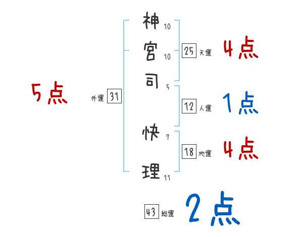 総運![]() | 神宮司快理さんの総運は43画の2つ星!頑固な性格で独立心が強いかも。やや非現実的で浪費に注意しましょう。 あなたの人生を表す1番重要な運勢です。生涯を通じて影響する総合運となり、主に50歳以降の晩年期に影響を及ぼします。 |