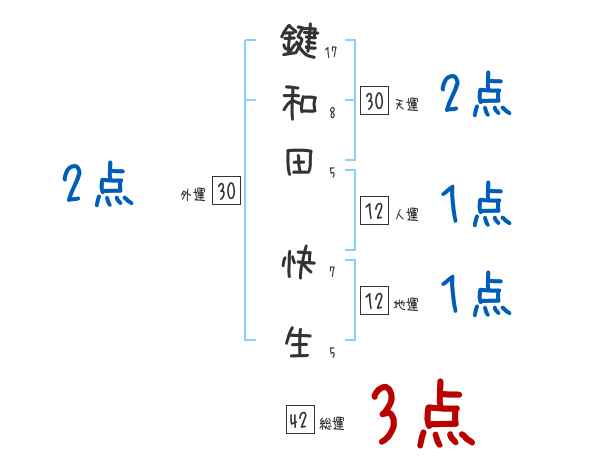 天運![]() | 鍵和田快生さんの天運は30画の2つ星!浮き沈みの激しさに注意しましょう。 家系が持つ宿命的な運勢を表します。祖先から受け継いだ苗字ですので自分の力が及びません。家柄を象徴します。 |