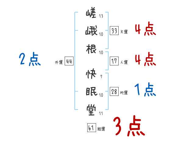総運![]() | 嵯峨根快眠堂さんの総運は61画の3つ星!強情な性格でうぬぼれタイプ。自ら破滅する。 あなたの人生を表す1番重要な運勢です。生涯を通じて影響する総合運となり、主に50歳以降の晩年期に影響を及ぼします。 |