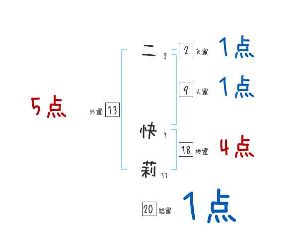 外運![]() | 二快莉さんの外運は13画の5つ星!才能に恵まれ人気がある。名声を手に入れる。円満な人生。 生活面を象徴する運勢です。外部から受ける影響力を表し、結婚運、家庭運や職場、環境への順応性を表します。 |