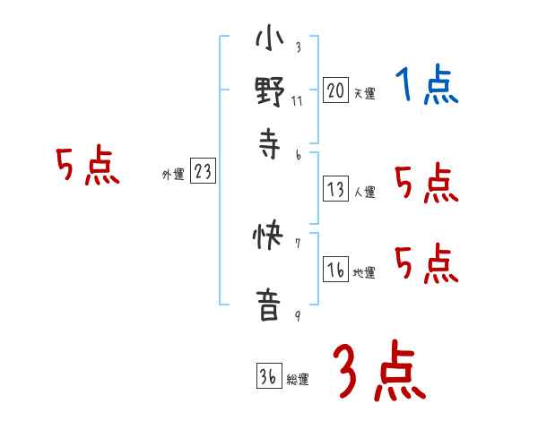 総運![]() | 小野寺快音さんの総運は36画の3つ星!先見性が豊かです。多少神経質で苦労することも。 あなたの人生を表す1番重要な運勢です。生涯を通じて影響する総合運となり、主に50歳以降の晩年期に影響を及ぼします。 |