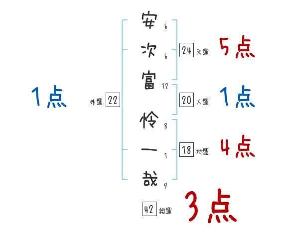 天運![]() | 安次富怜一哉さんの天運は24画の5つ星!家庭運が良く順調な人生。金運にも恵まれる。 家系が持つ宿命的な運勢を表します。祖先から受け継いだ苗字ですので自分の力が及びません。家柄を象徴します。 |