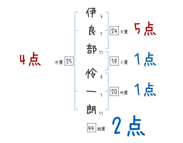 総運![]() | 伊良部怜一朗さんの総運は44画の2つ星!誠実で慎重な性格。物事を考えすぎないように注意しましょう。 あなたの人生を表す1番重要な運勢です。生涯を通じて影響する総合運となり、主に50歳以降の晩年期に影響を及ぼします。 |