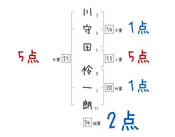 総運![]() | 川守田怜一朗さんの総運は34画の2つ星!独創性に優れるが、自尊心が強く災難に注意しましょう。 あなたの人生を表す1番重要な運勢です。生涯を通じて影響する総合運となり、主に50歳以降の晩年期に影響を及ぼします。 |