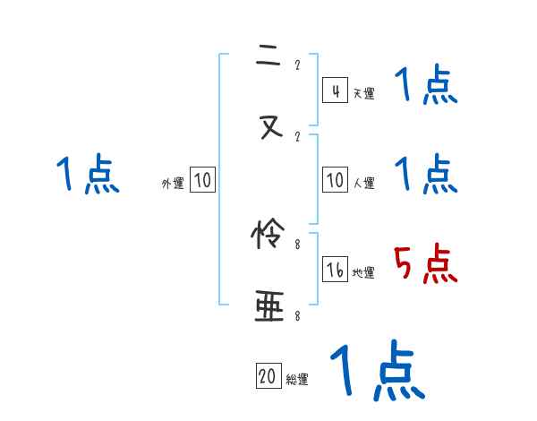 天運![]() | 二又怜亜さんの天運は4画の1つ星!感情が不安定で苦労するかも。周囲との協調を心掛けましょう。 家系が持つ宿命的な運勢を表します。祖先から受け継いだ苗字ですので自分の力が及びません。家柄を象徴します。 |