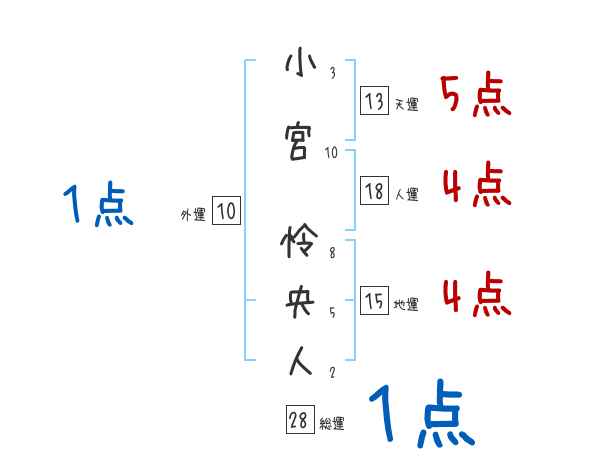 天運![]() | 小宮怜央人さんの天運は13画の5つ星!才能に恵まれ人気がある。名声を手に入れる。円満な人生。 家系が持つ宿命的な運勢を表します。祖先から受け継いだ苗字ですので自分の力が及びません。家柄を象徴します。 |