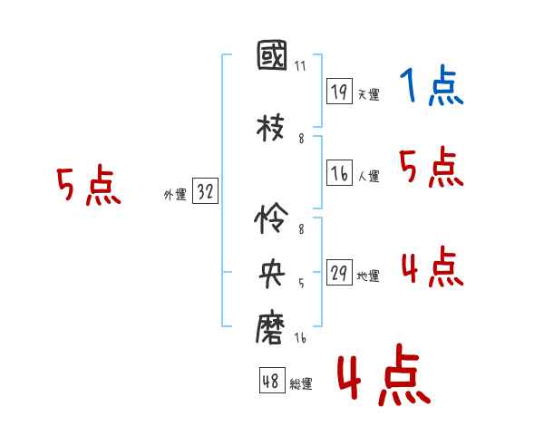 外運![]() | 國枝怜央磨さんの外運は32画の5つ星!柔軟性があり成功する。チャンスが多く金運が良い。 生活面を象徴する運勢です。外部から受ける影響力を表し、結婚運、家庭運や職場、環境への順応性を表します。 |